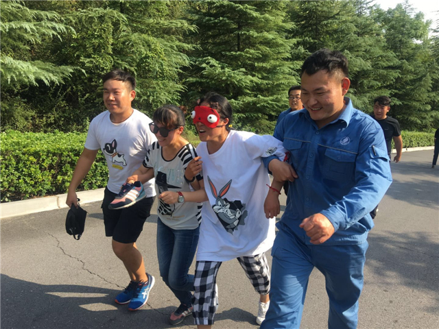 每一小团队在折返点领取比赛号码后按照原路返回,在离终点100米处其中一名队员脱掉一只鞋充当成伤员,另一名队员当盲人,团队采用抬、扶、背的方式把两名伤员一起带回终点。在趣味活动中,职工还实践了救助技能,活动意义更加深刻,顺利抵达终点后,大家都收获了成功的喜悦。